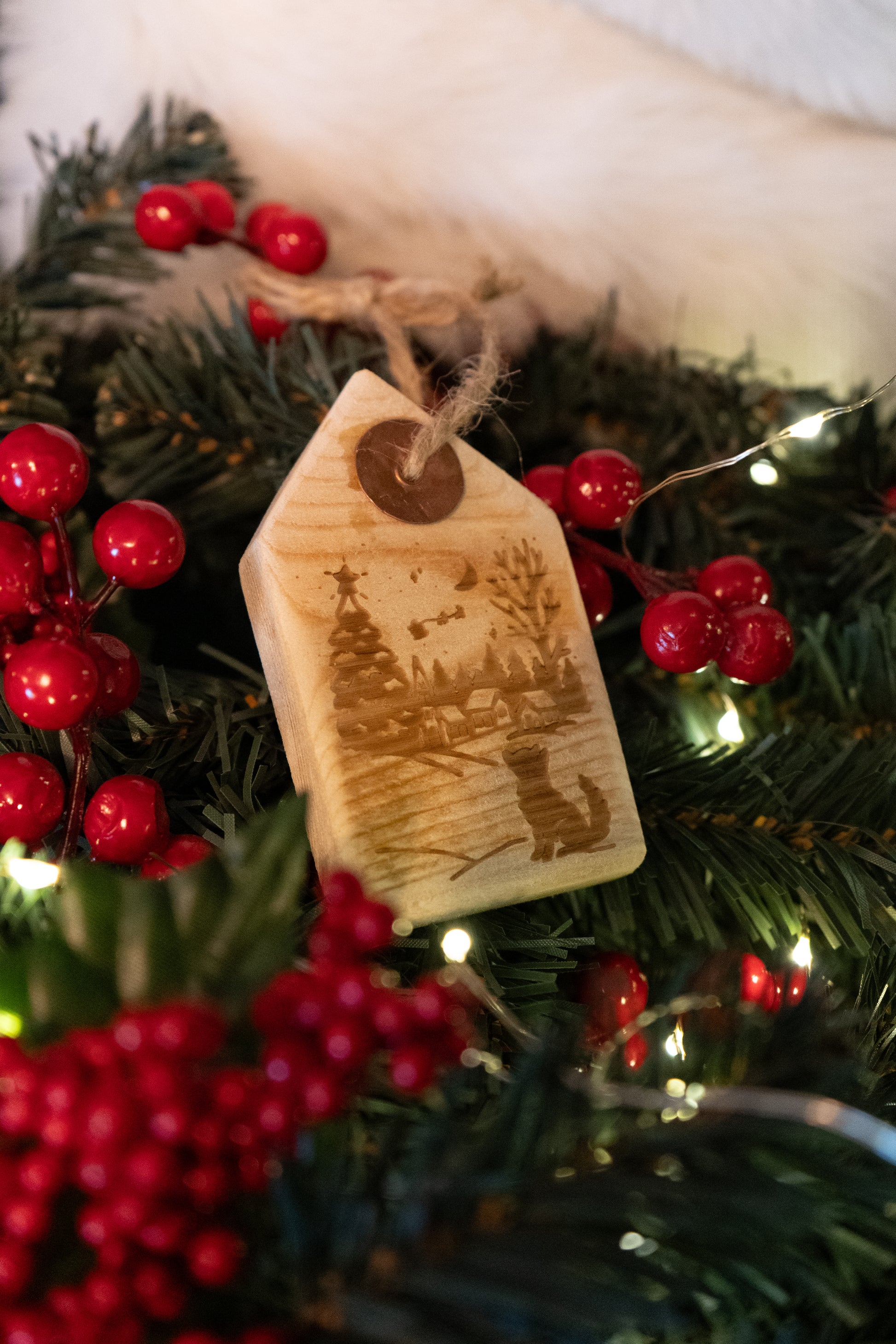 Handcrafted wooden gift tag inspired ornaments, laser engraved with a design of your choice and finished with a copper rivet for that rustic/industrial aesthetic